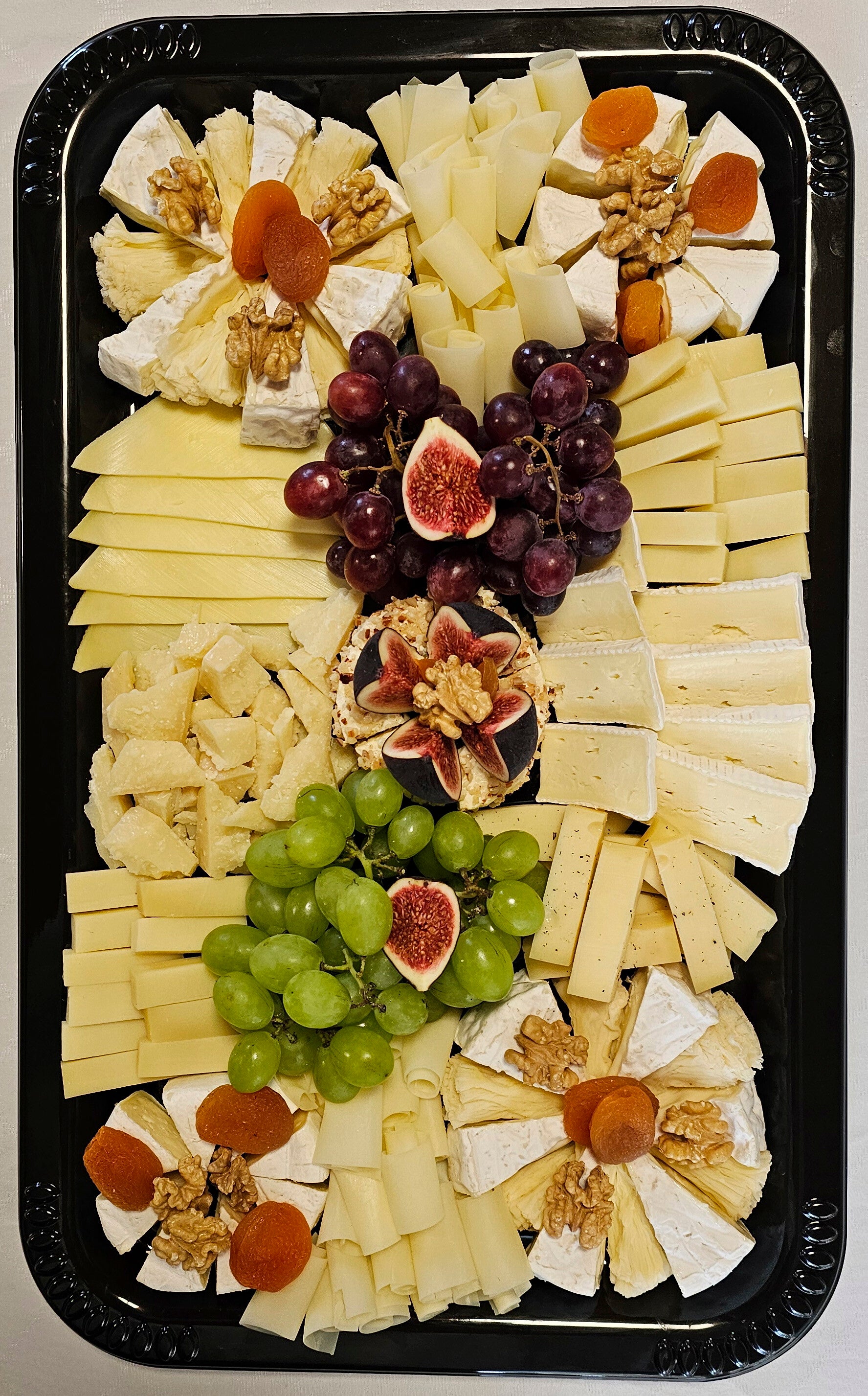 Diverse Käsesorten, schön dekoriert mit Früchten.