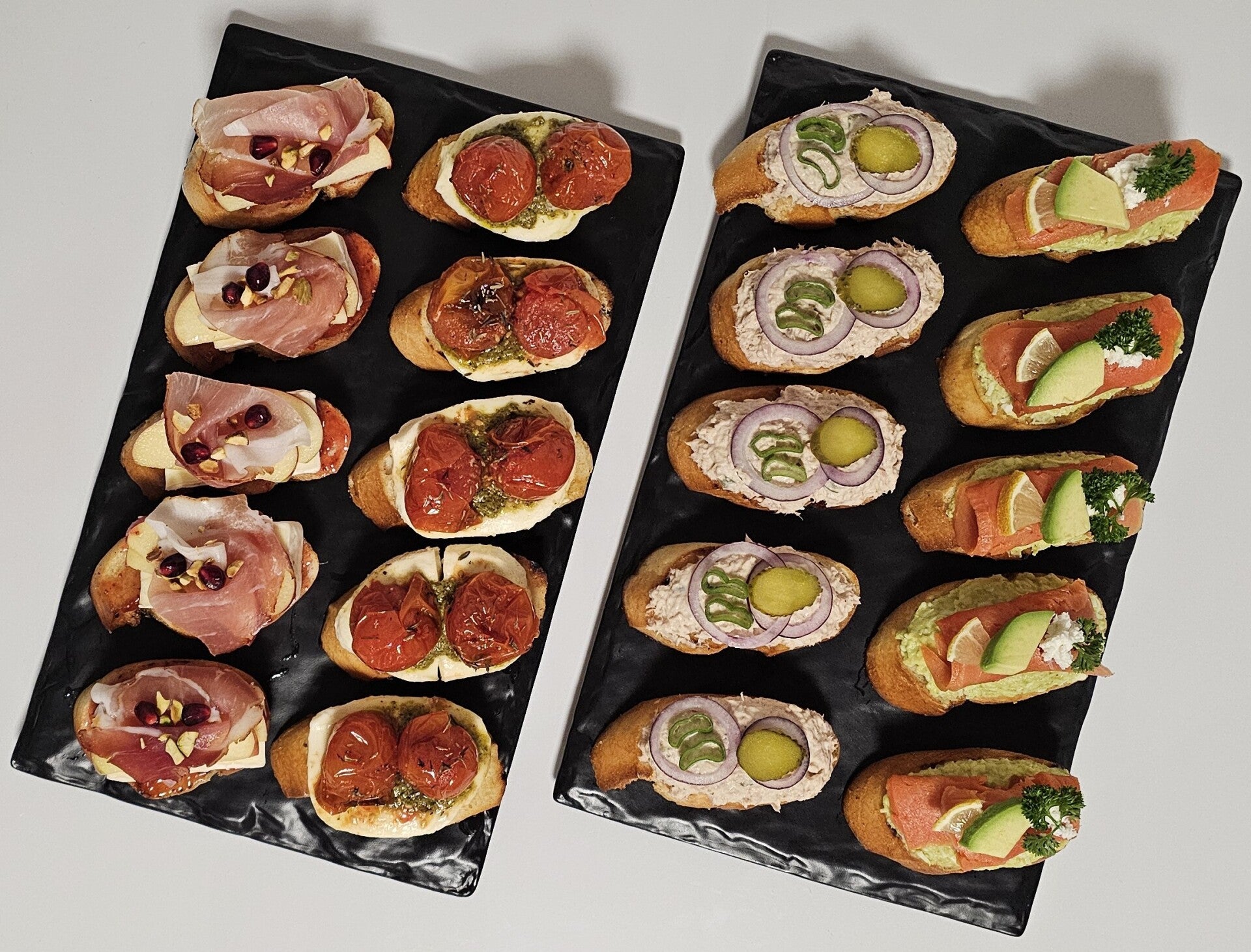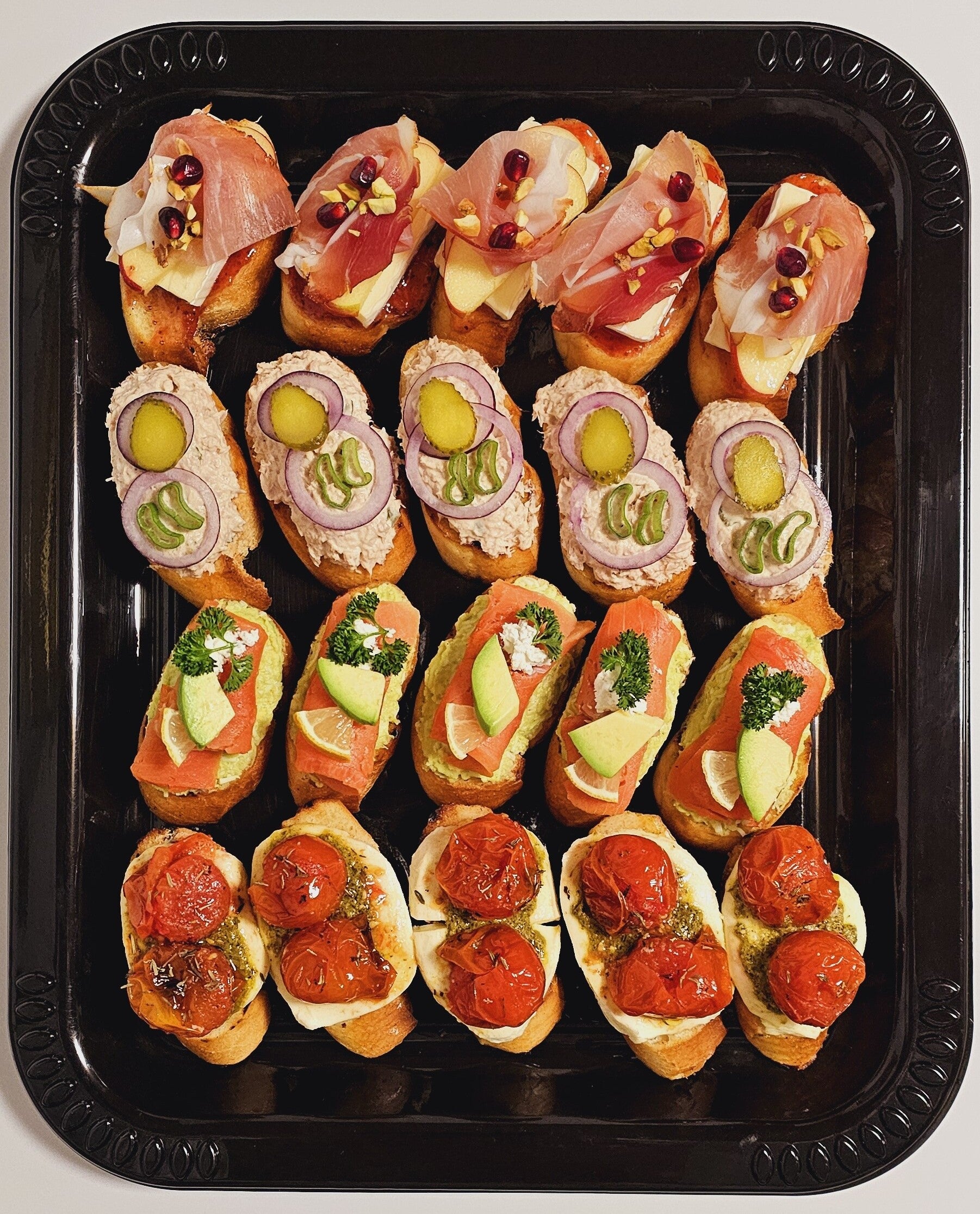 4 verschiedene Sorten à 5 Stück. Schinken mit Brie, Thon garniert mit Zwiebeln und Gurke, Lachs mit Avocado, gegrillte Tomaten auf Mozzarella. Kann nach Wunsch zusammengestellt werden.