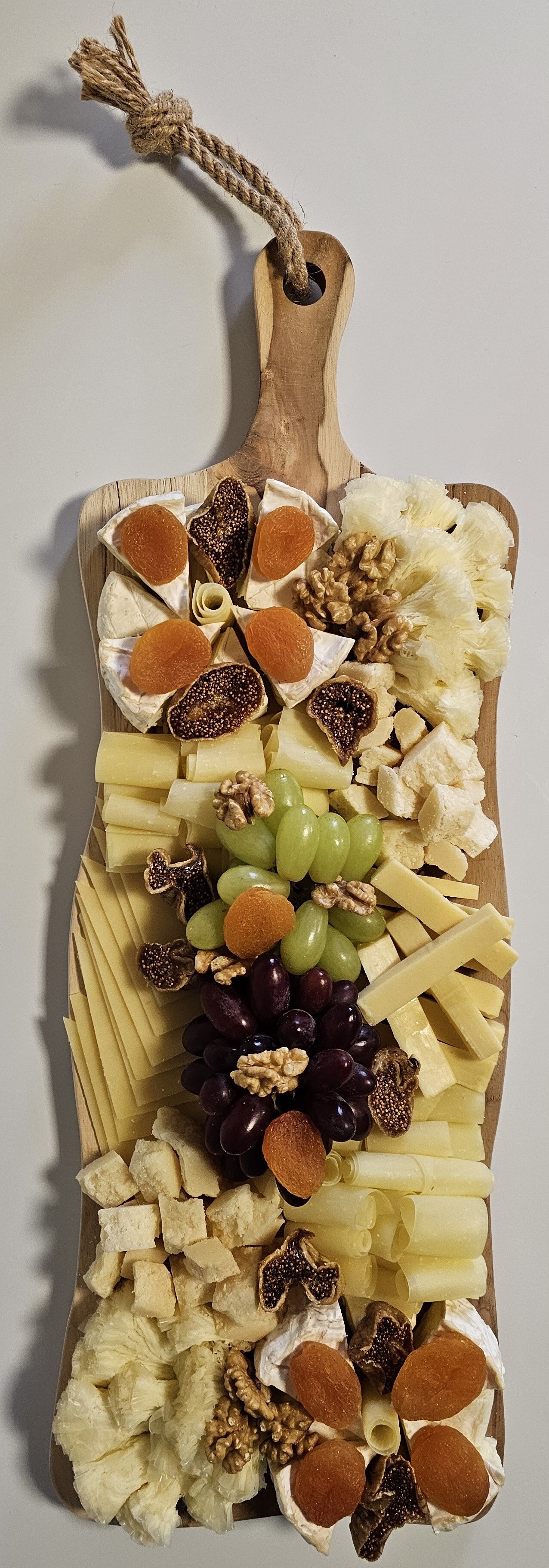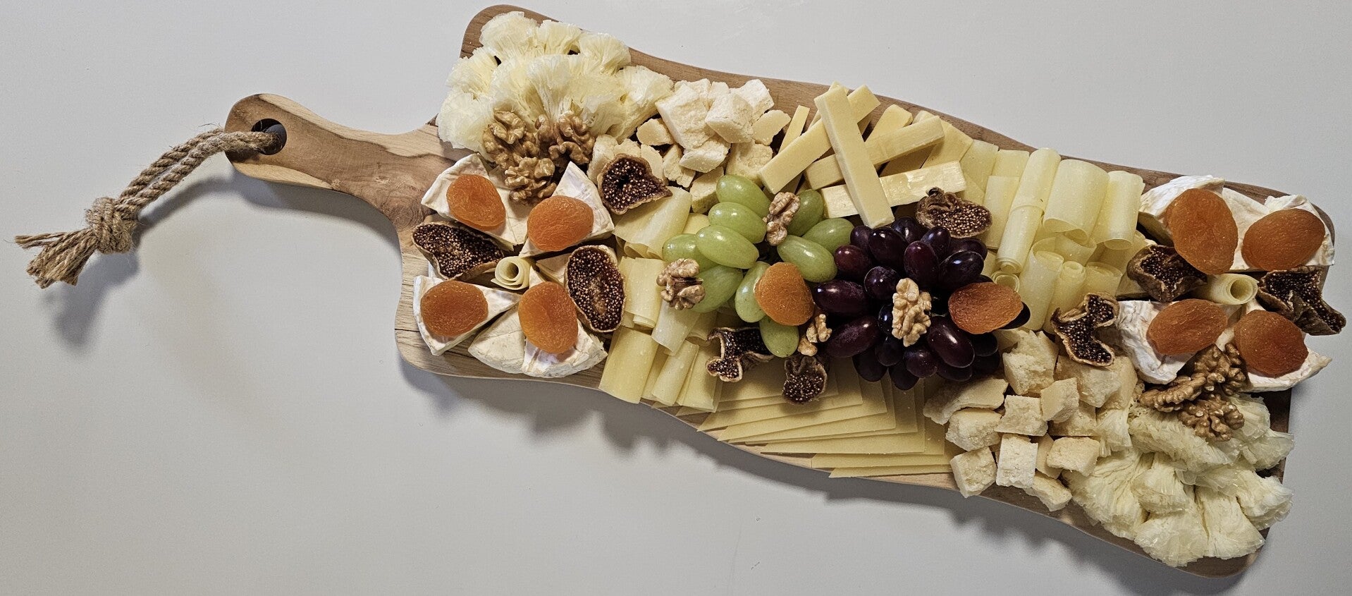 Verschiedene Käsesorten, fein angerichtet auf einem langen Holzbrett.